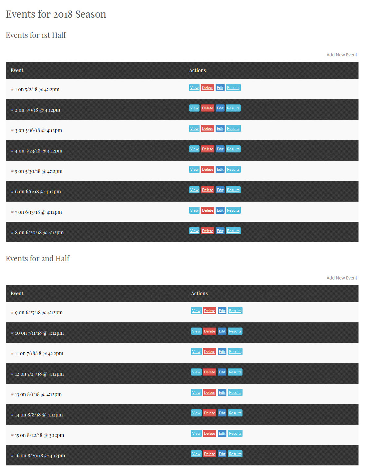 - The following is an example of my league's 2018 season containing 2 sessions and 17 events: